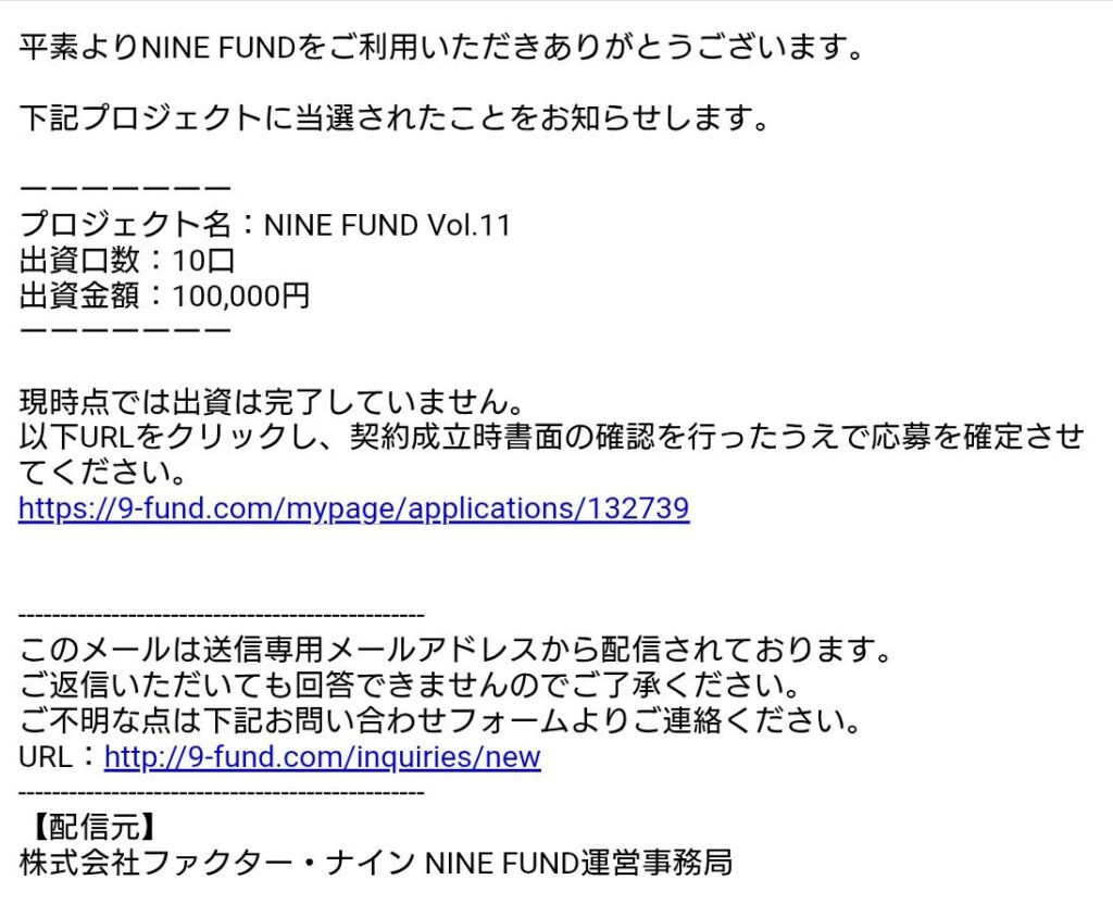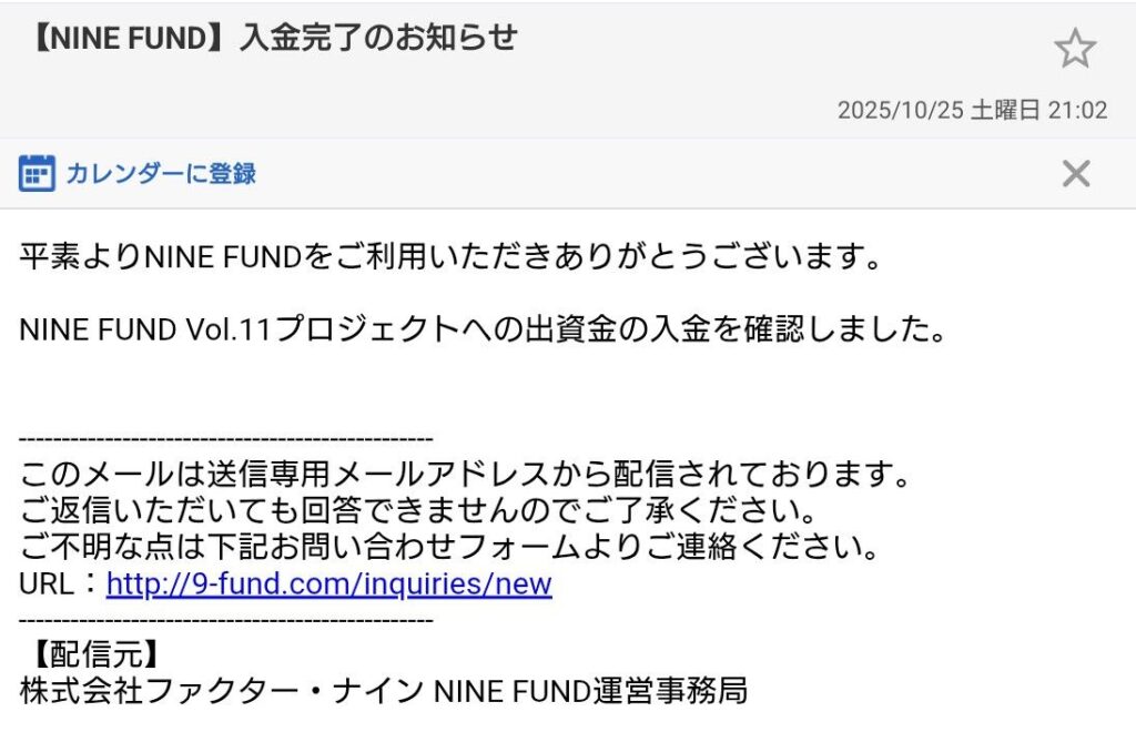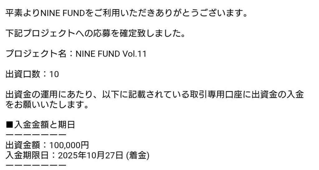 2025/10/24の投資状況 ソーシャルレンディング X Facebook はてブ Pocket LINE コピー 2025.10.242025.10.26 今日の様子 NINE FUND 最近、登録したところですが、抽選当選しました! 後日追記 翌日に応募を確定させて、入金済ませました